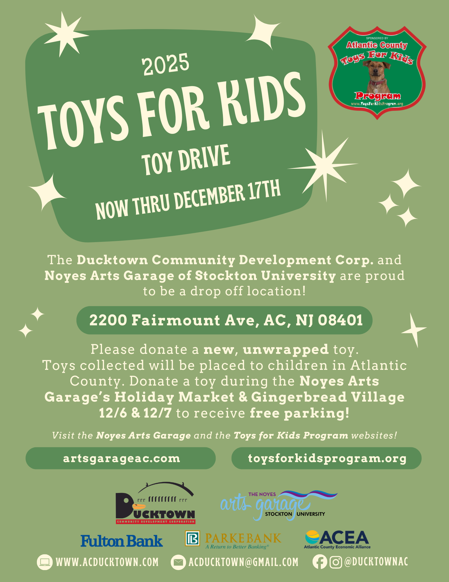 The Ducktown Community Development Corp. and the Noyes Arts Garage of Stockton University are proud to be a drop off location for the “Toys for Kids Program” of Atlantic County. Donate a new, unwrapped toy on December 6 & 7 to receive free parking at the WAVE parking garage during the Noyes Holiday Market and Gingerbread Village event!