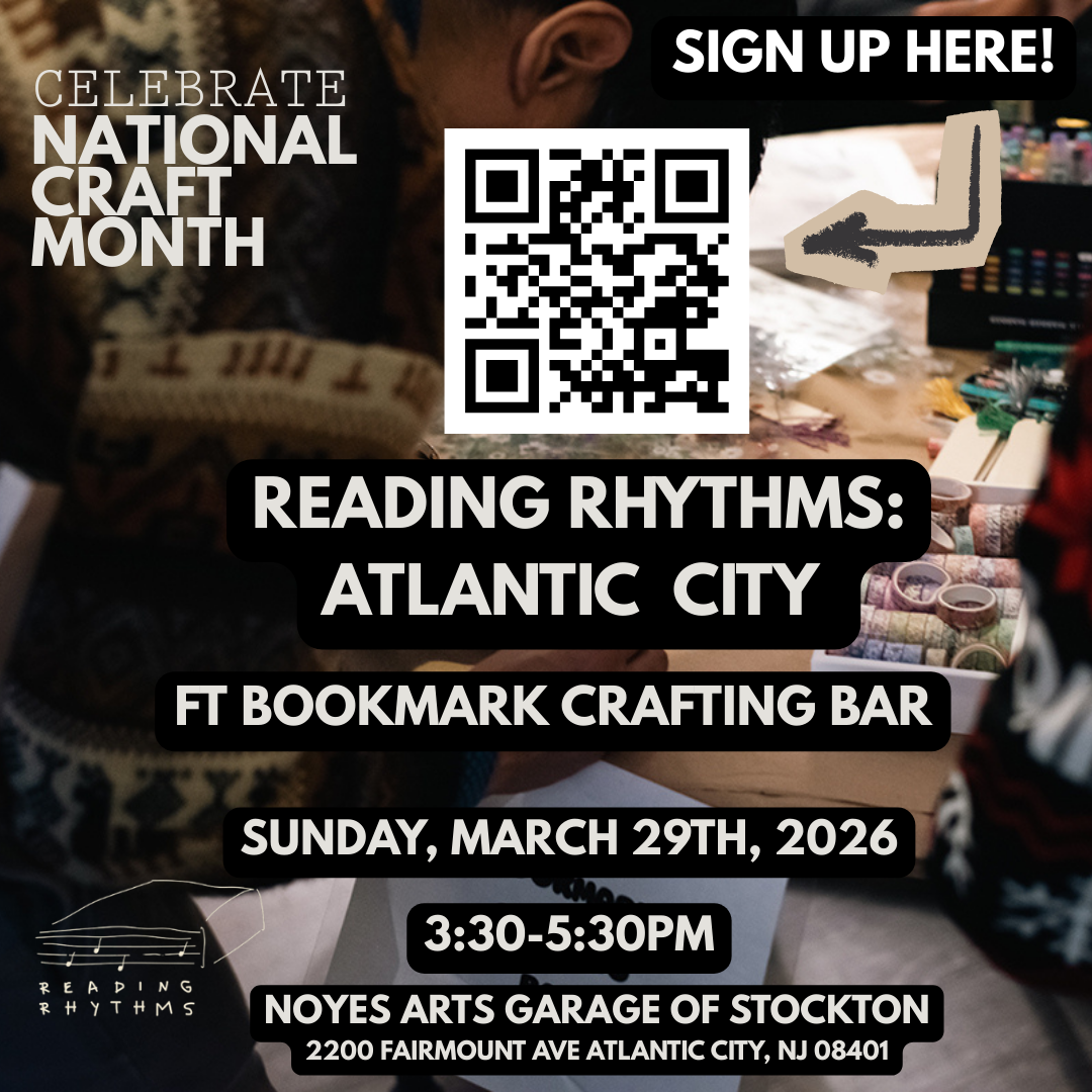 Join us for a one-of-a-kind Reading Rhythms party on March 29th at the Noyes Arts Garage of Stockton University! The community is invited to come together to read, connect, and share in community while surrounded by the creativity of local artists.