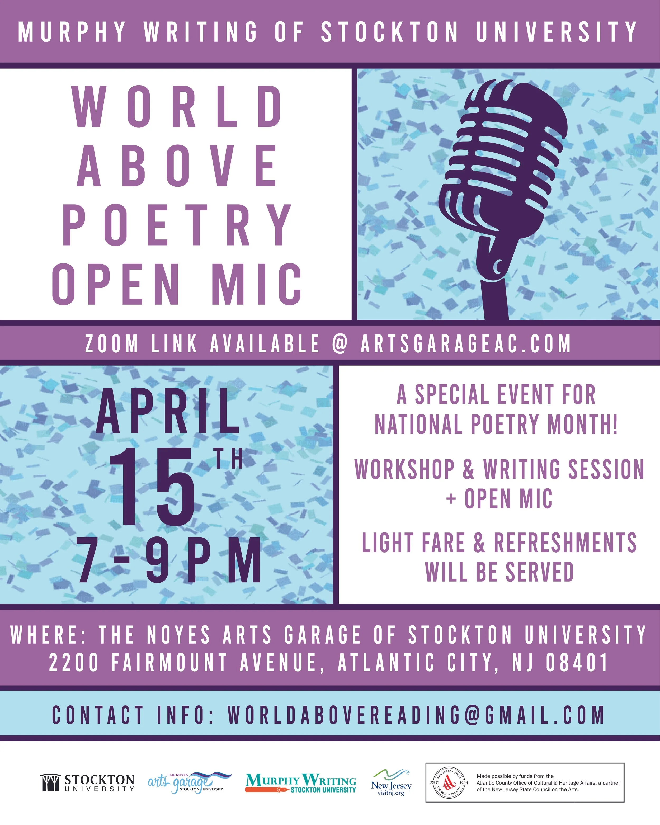 The Murphy Writing Center and the Noyes Arts Garage of Stockton University present a free community program each month, World Above: Poetry Open Mic to Stockton University’s Noyes Arts Garage (2200 Fairmount Ave, Atlantic City, NJ 08401). This monthly program is hosted by multidisciplinary artist, content creator, and educator, Dimitri Reyes.